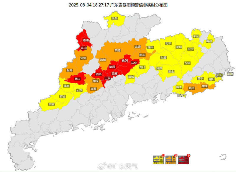 据广东省气象局通报,截至18时27分,广东省内暴雨红、橙、黄预警分别有9、10、23个正在生效中,还夹带了雷雨大风预警。受低涡和西南急流影响,近日广东省降雨频繁,土壤含水量高,地质灾害风险较高,需注意防范强降水及其引发的山洪、泥石流、滑坡、崩塌等地质灾害,务必提高警惕,做好防范措施。