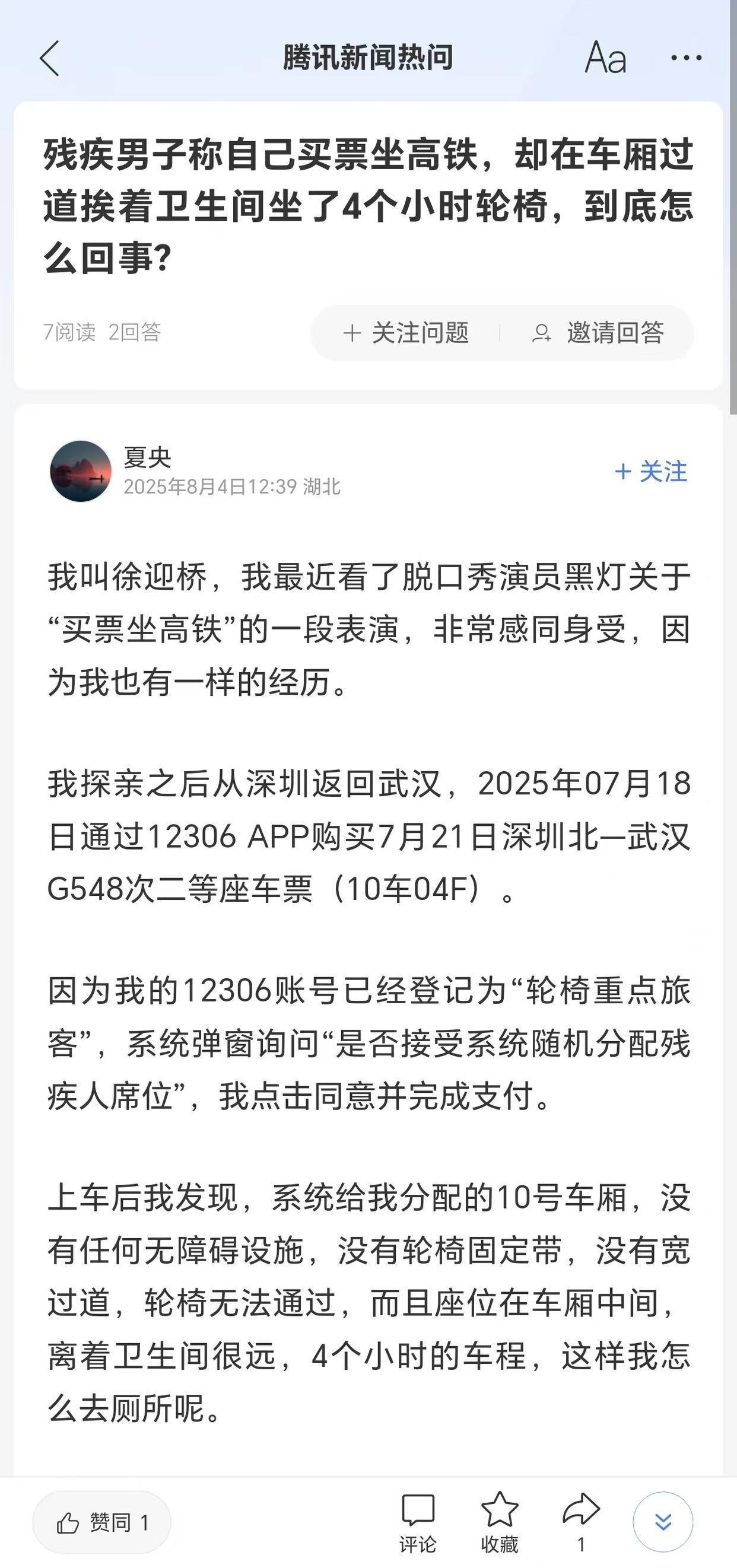近日,盲人脱口秀演员黑灯,在一次表演中讲段子吐槽了“盲人买不到残疾人专座”这一现象,引起了一定的讨论。年过七旬的徐大爷对此相当感同身受,在7月他有过这么一段经历,8月4日,他也在腾讯新闻热问上发声分享了这段经历,获得了网友的关注。