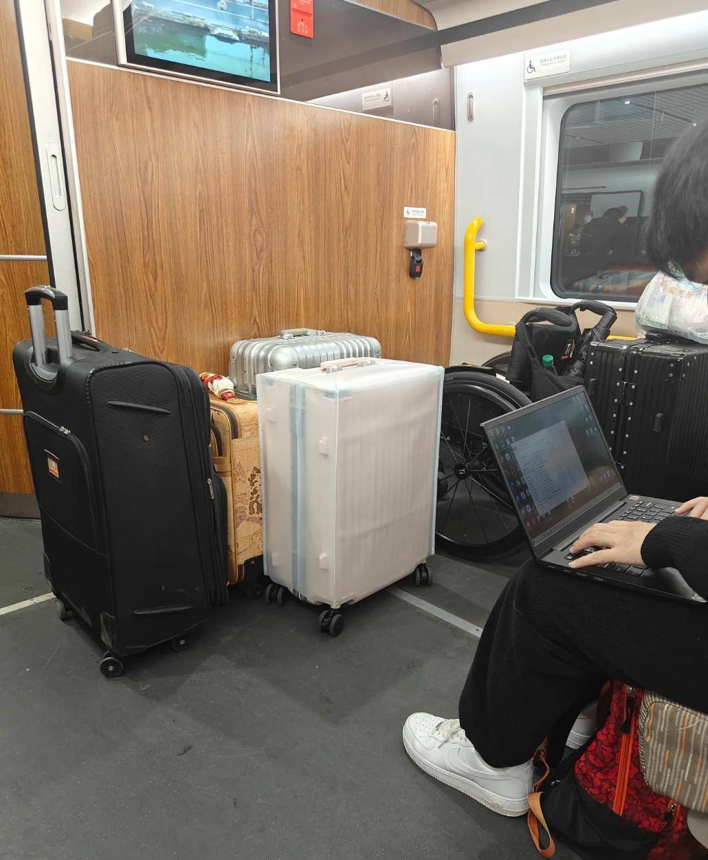 高铁上平时被堆满行李的残疾人专用空间。网络截图。